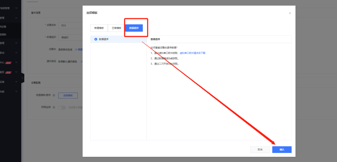 添加模板—選擇“數(shù)據(jù)透傳”模板,點擊“確認(rèn)”
