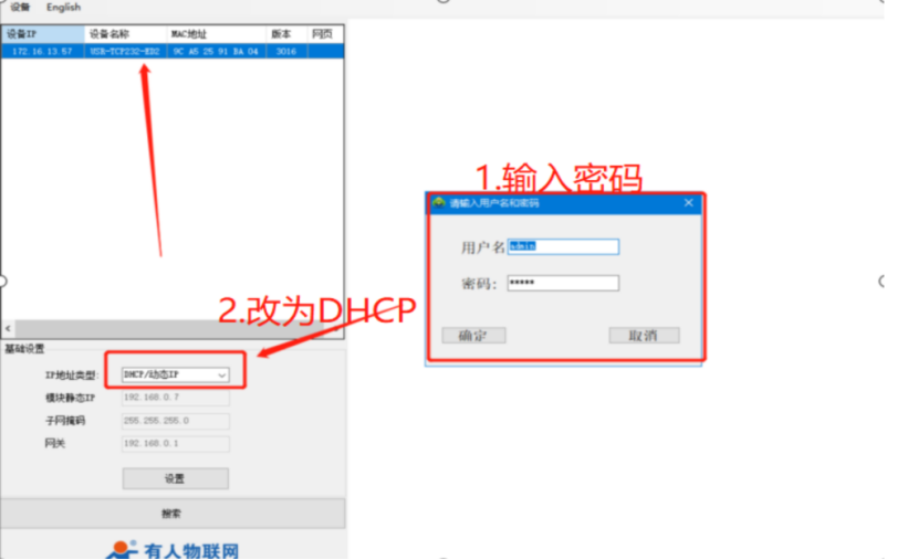 將IP地址獲取方式從靜態(tài) IP改為DHCP,保存設(shè)置,單擊搜索,找到設(shè)備之后,單擊產(chǎn)品名稱信息彈出輸入用戶名admin和密碼admin,點擊確定。在右上角點擊中英文切換
