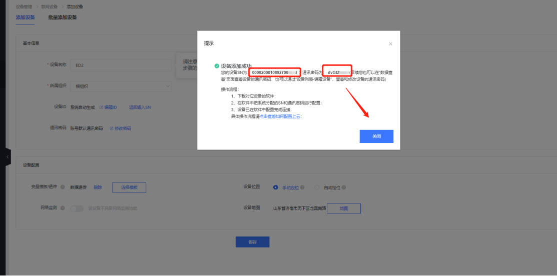 注:確認(rèn)以后,系統(tǒng)會生成設(shè)備編號和通訊密碼,這個編號和密碼之后會在設(shè)置軟件里用到。(也可以點擊設(shè)備查看編號和密碼)