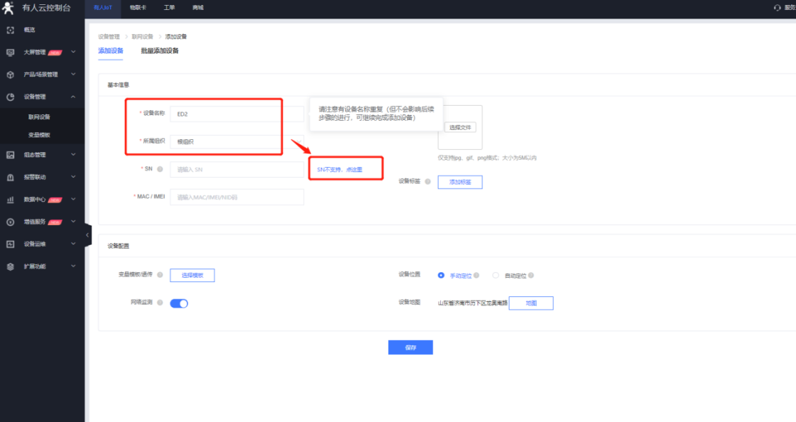 3.添加ED2模塊:填寫完設(shè)備名稱,所屬組織后,點擊“SN不支持,點這里”