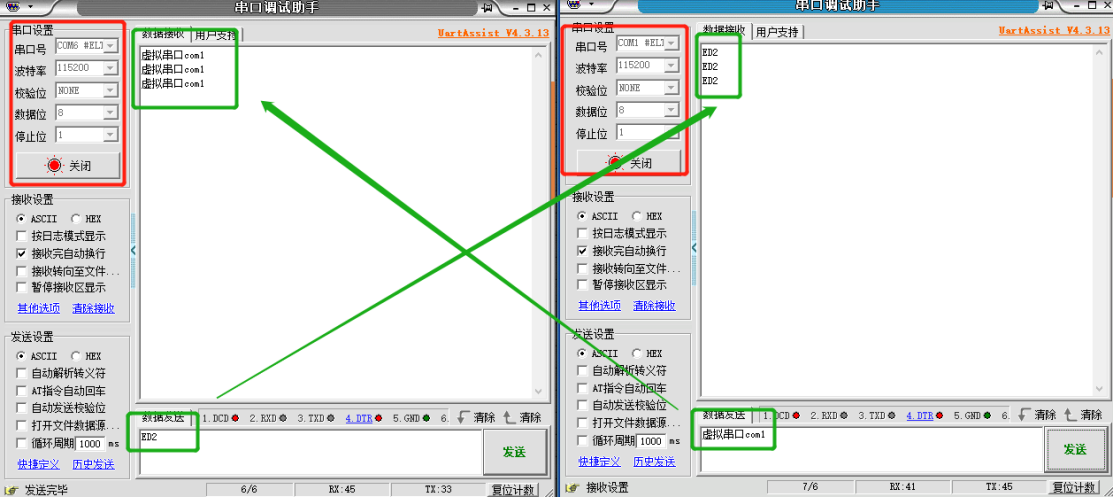 7.數(shù)據(jù)傳輸測試,打開兩個串口調(diào)試助手軟件,選擇正確的串口以及串口參數(shù),分別打開設(shè)備插在電腦上識別到的COM口和創(chuàng)建的虛擬串口,具體數(shù)據(jù)測試截圖如下: