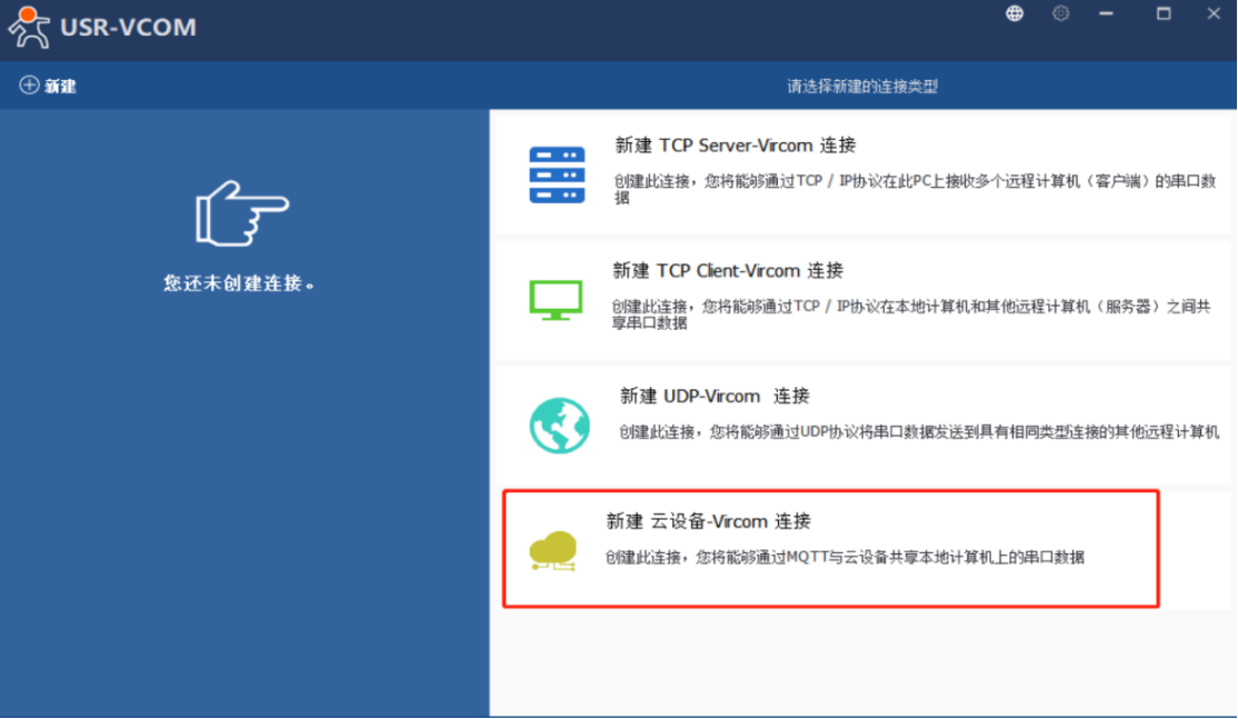 4.打開虛擬串口軟件,點擊第四個“新建云設(shè)備-Vircom連接”