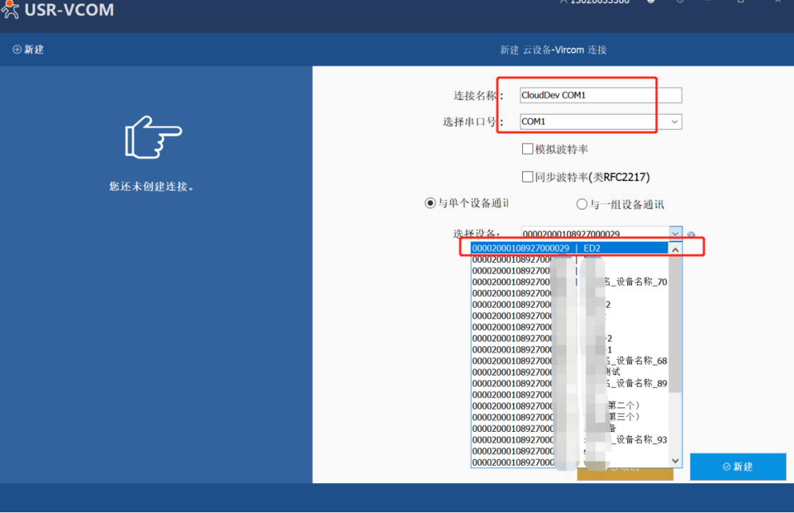 6.自定義選擇虛擬串口號,綁定云端ED2的設(shè)備ID,點擊新建