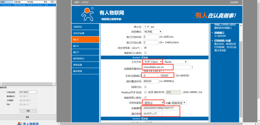 3、工作模式選擇網(wǎng)絡(luò)透傳模式,服務(wù)器A填寫云平臺的IP和端口:clouddata.usr.cn,15000并且啟用注冊包,注冊包發(fā)送方式選擇為連續(xù)發(fā)送,注冊類型選擇有人云,設(shè)備編號和密碼在云平臺設(shè)備列表查看具體設(shè)備SN和密碼,填寫無誤后點擊保存參數(shù),并重啟設(shè)備。