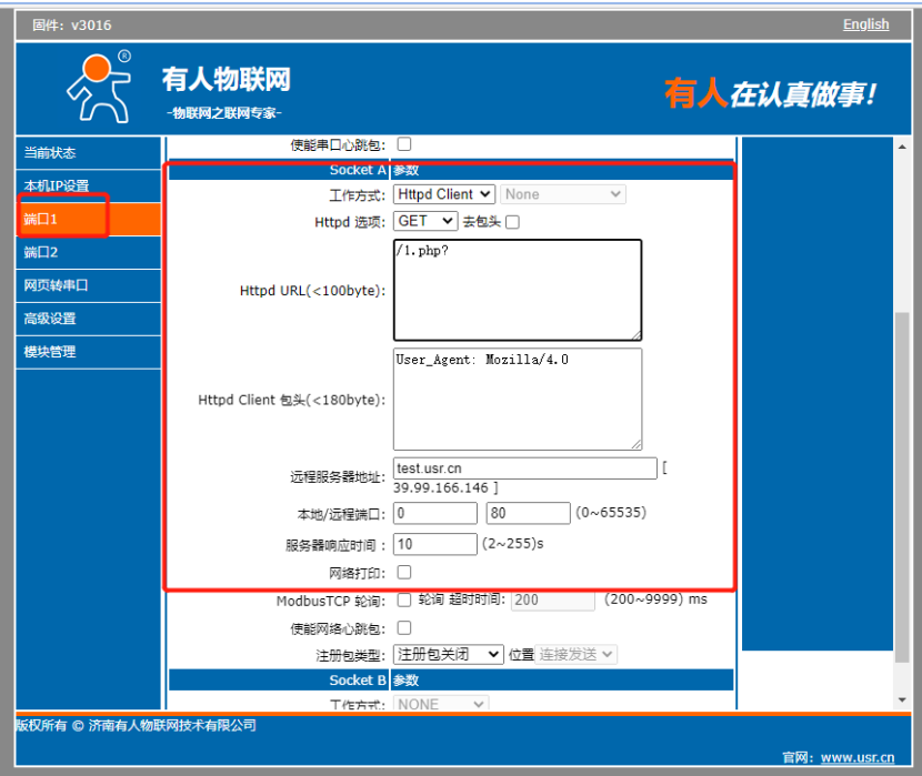 4、端口1工作方式設(shè)置HTTPD模式,GET,遠(yuǎn)程服務(wù)器地址填test.usr.cn,遠(yuǎn)程端口填80,本地端口號設(shè)置為0。URL填/2.php?,不濾除包頭。保存參數(shù),重啟模塊。