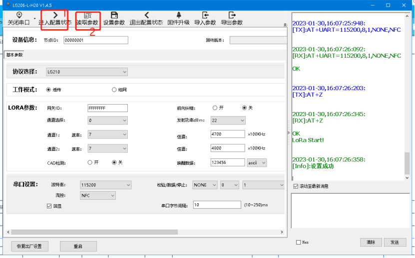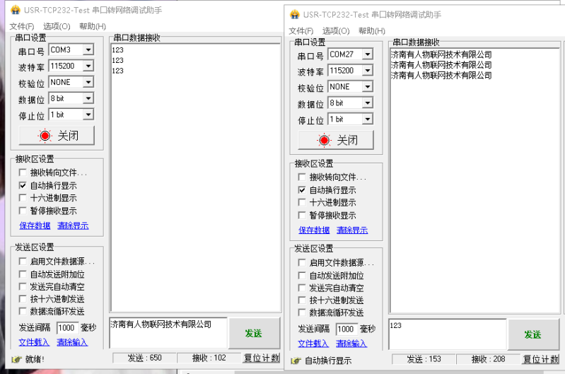 啟動(dòng)兩個(gè)串口調(diào)試助手(模擬串口設(shè)備1,2)分別連接兩臺(tái)LORA設(shè)備的串口,使用串口設(shè)備1發(fā)送數(shù)據(jù)串口設(shè)備2可接收數(shù)據(jù)(反之亦然),通信效果如下圖所示: