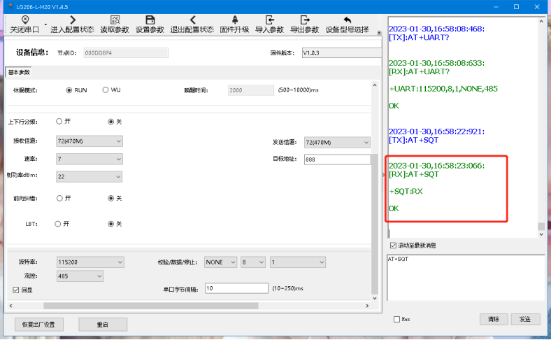 1、LORA傳輸設(shè)備A進(jìn)入命令模式發(fā)送AT+SQT進(jìn)入信號(hào)強(qiáng)度監(jiān)聽狀態(tài)