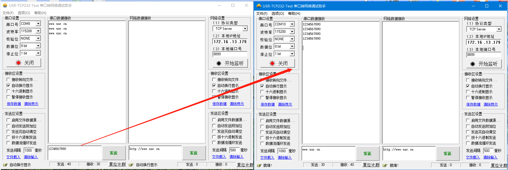 打開2個(gè)串口調(diào)試助手,分別打開發(fā)送端的com8 115200 N 8 1) 和接收端的com10(115200 N 8 1),互相發(fā)送數(shù)據(jù)。