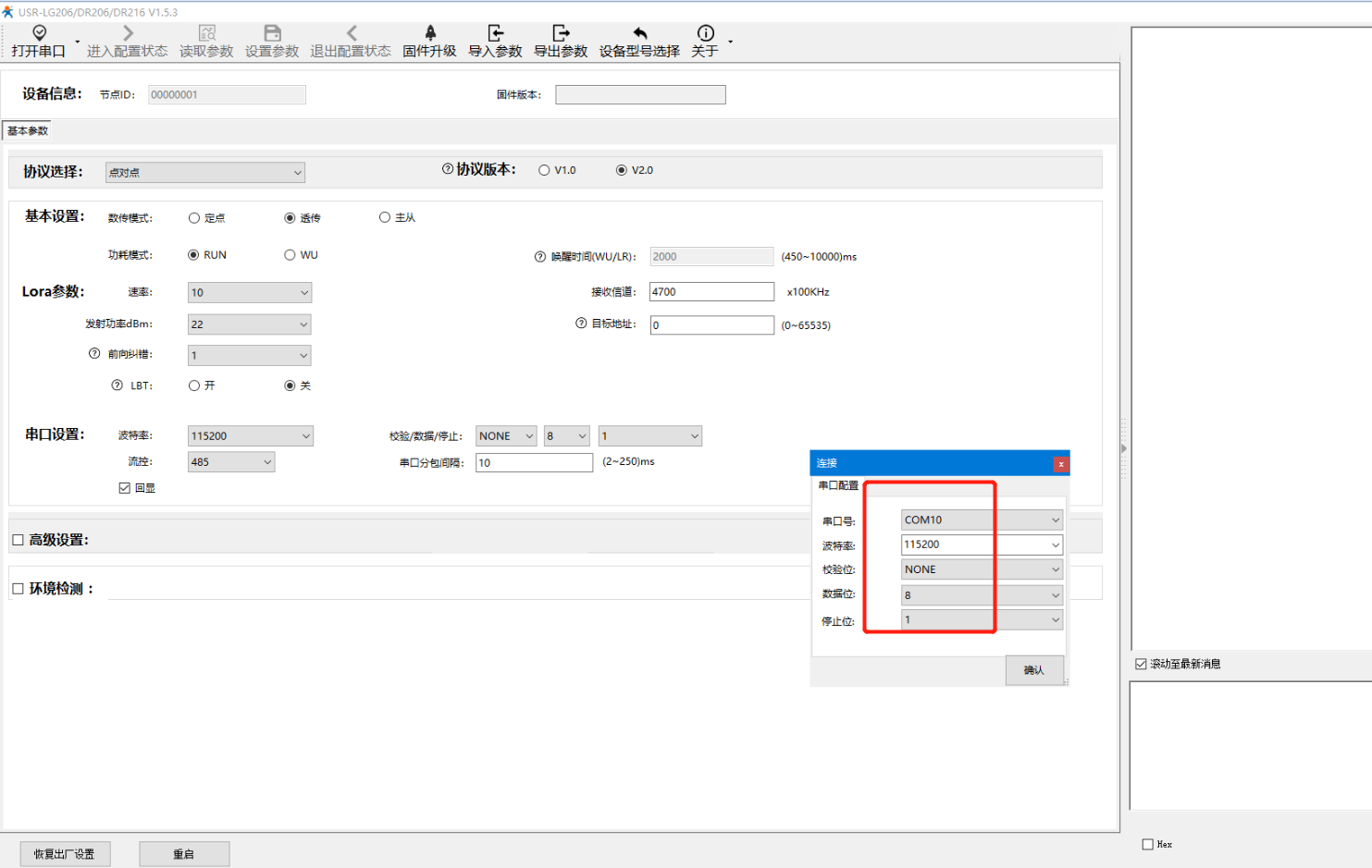 1)電腦打開USR-DR206-L的設(shè)置軟件,選擇對應(yīng)的串口線COM口號。(此處為com10)