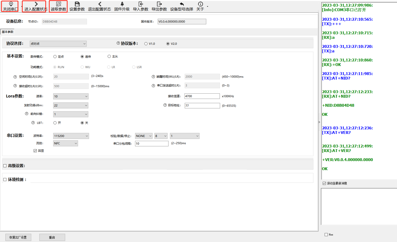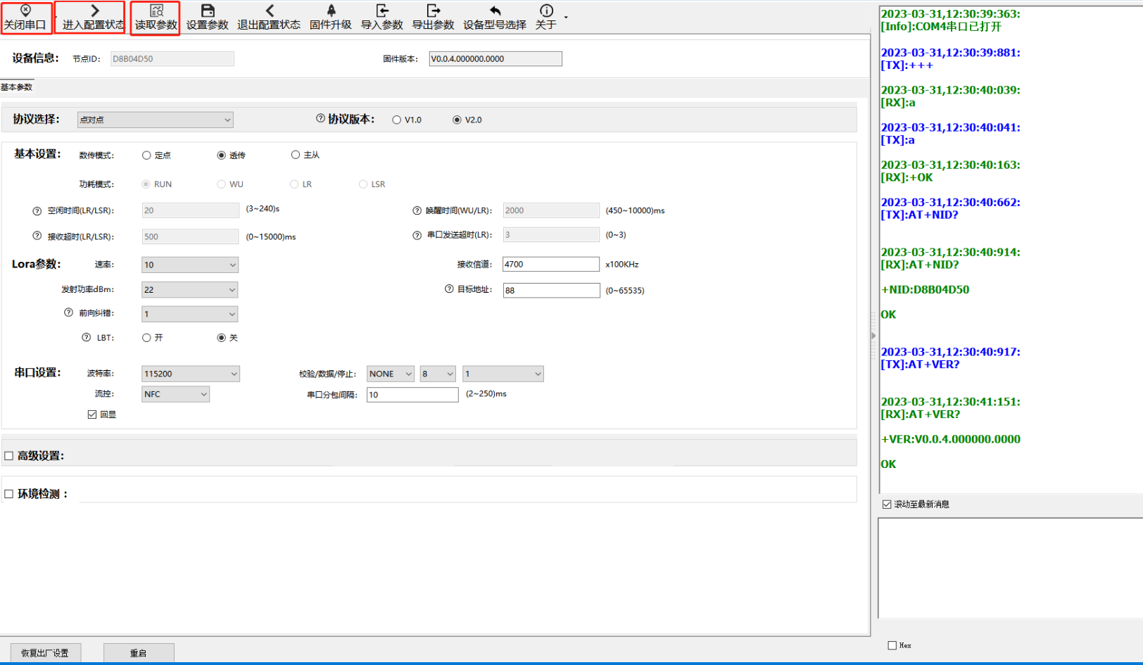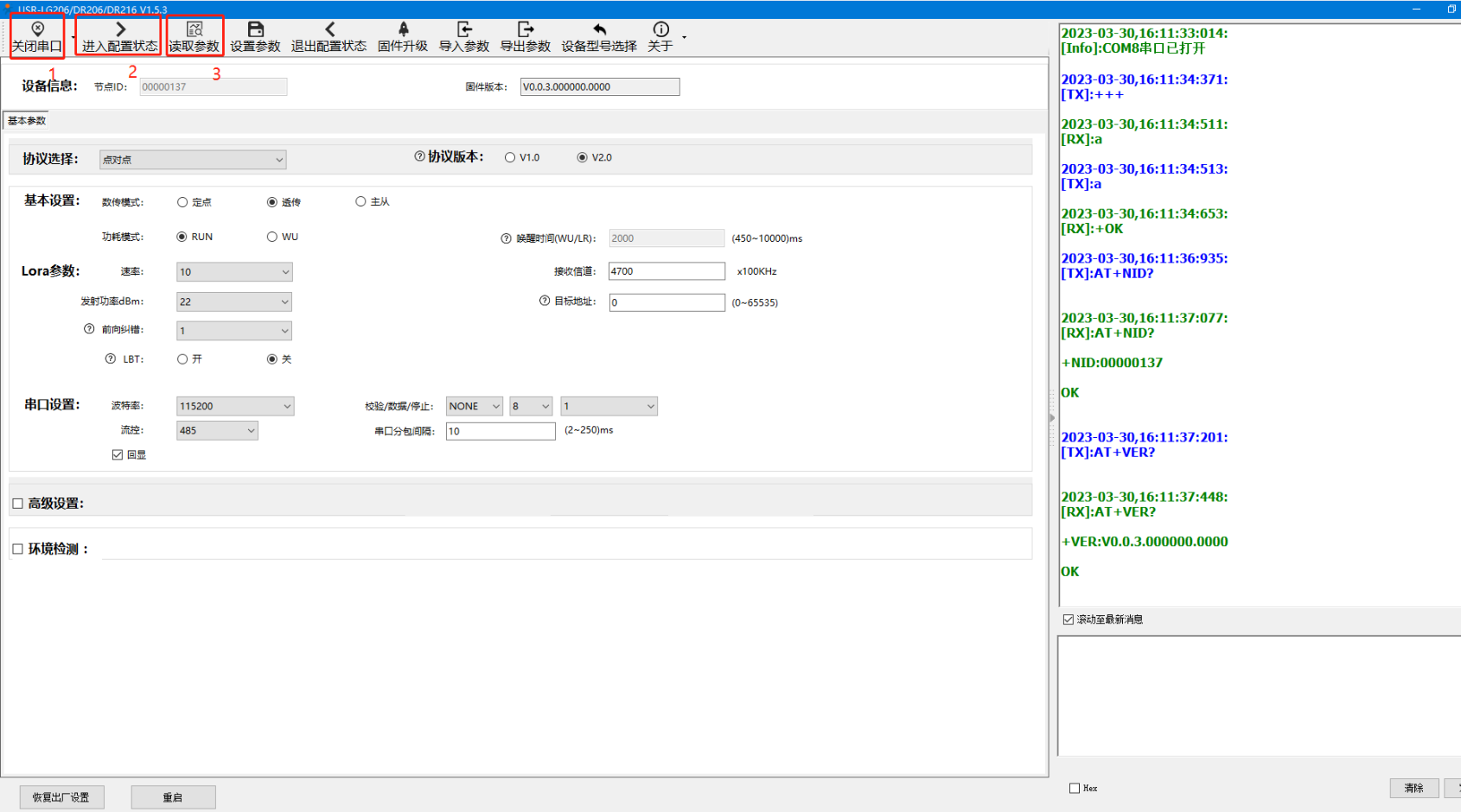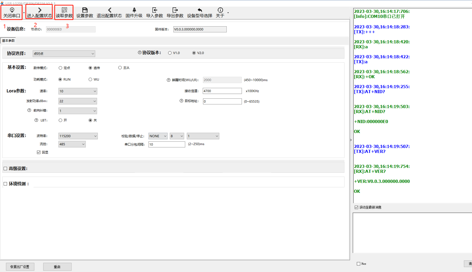 2)按照順序點(diǎn)擊“打開串口”---“進(jìn)入配置狀態(tài)”---“讀取參數(shù)”