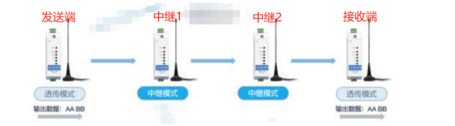 從DR206(發(fā)送端)發(fā)數(shù)據(jù),因接收數(shù)據(jù)中攜帶的組號、地址與中繼1和中繼2的不一致,所以會通過DR206(中繼1)和DR206(中繼2)進(jìn)行數(shù)據(jù)中繼轉(zhuǎn)發(fā),最終因接收端模組接收的數(shù)據(jù)中攜帶的組號、地址與自身一致,則接收端DR206會直接輸出到串口,不進(jìn)行轉(zhuǎn)發(fā)。