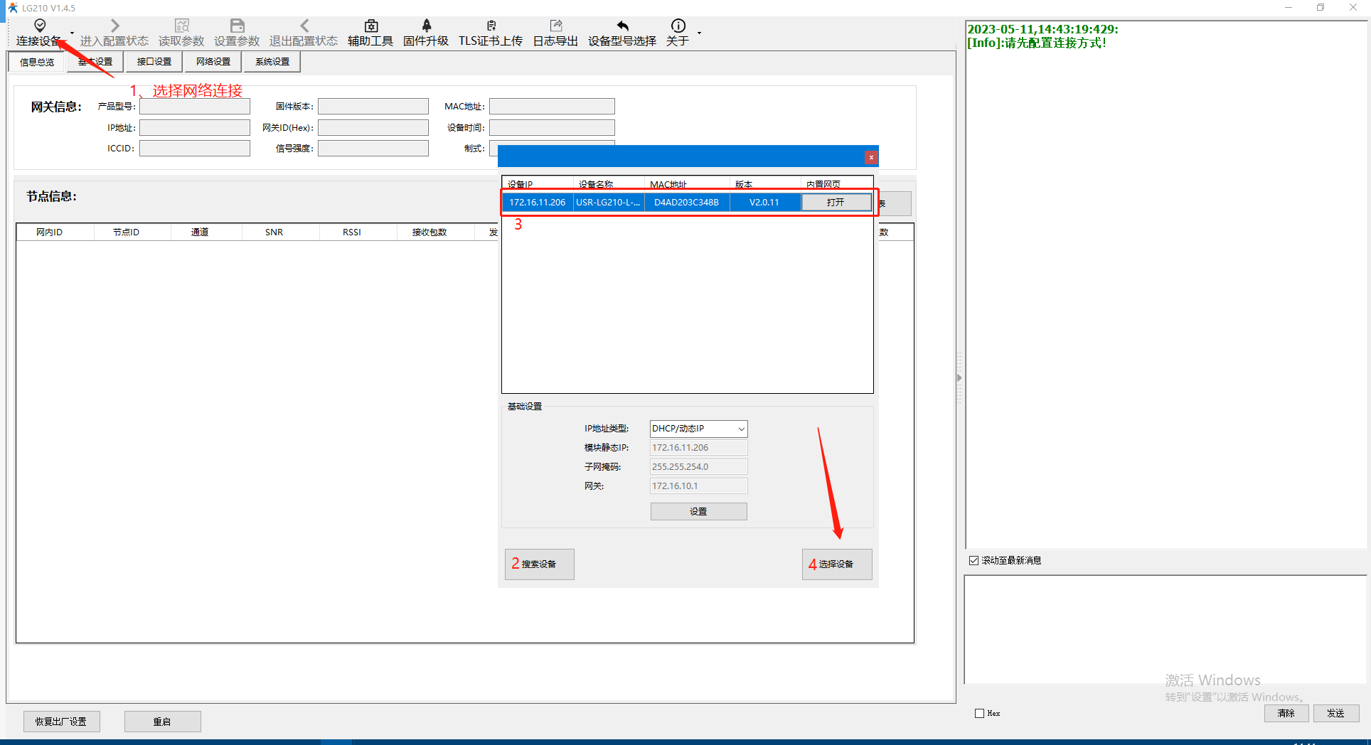 網口參數LG210默認為DHCP自動獲取ip,若需要LG210做靜態(tài)ip的話,可以自行修改,本次測試為自動獲取獲取ip。