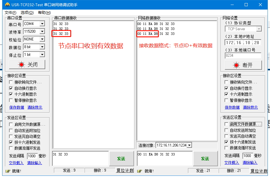 電腦打開一個串口轉網絡調試助手,打開對應USR-DR206-L串口線COM口號,USR-LG210網絡端發(fā)送16進制的數據(數據格式:節(jié)點ID+有效數據),有效數據透傳給DR206串口。DR206串口發(fā)送 HEX數據,數據傳輸給LG210網絡端,接收數據顯示(數據格式為:16進制節(jié)點ID+有效數據)