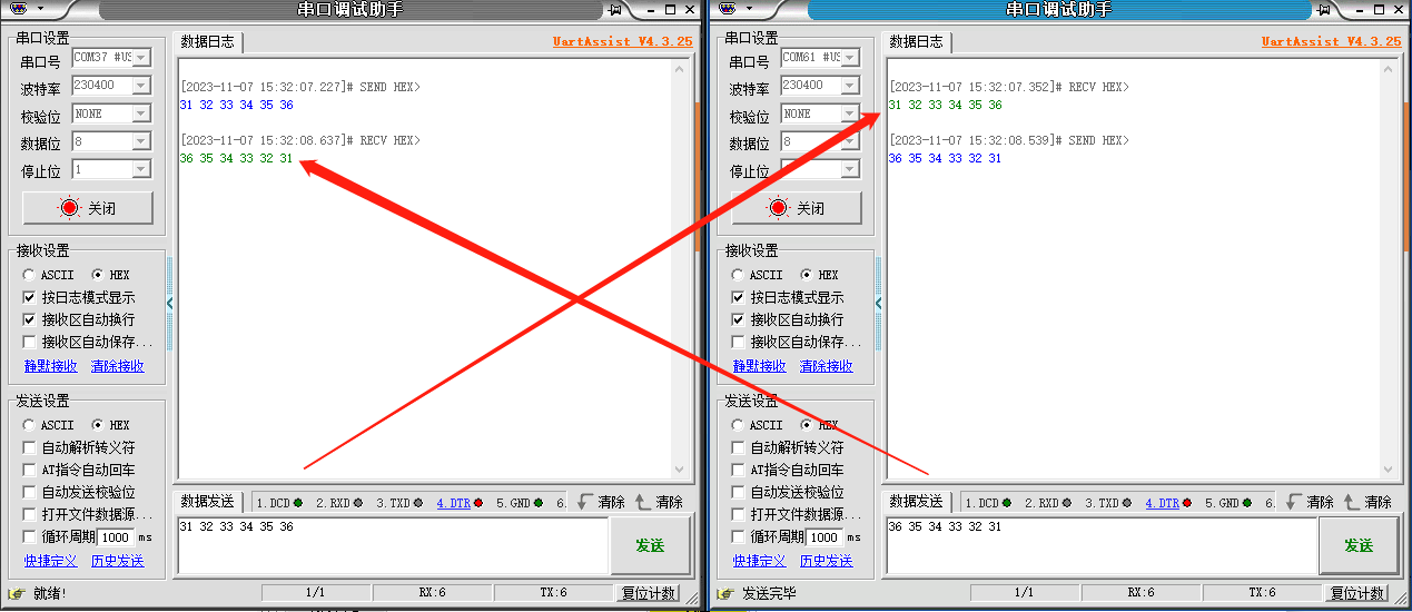 設(shè)備的兩串口分別用串口軟件打開可以測(cè)試數(shù)據(jù)相互透?jìng)鳌?/p>