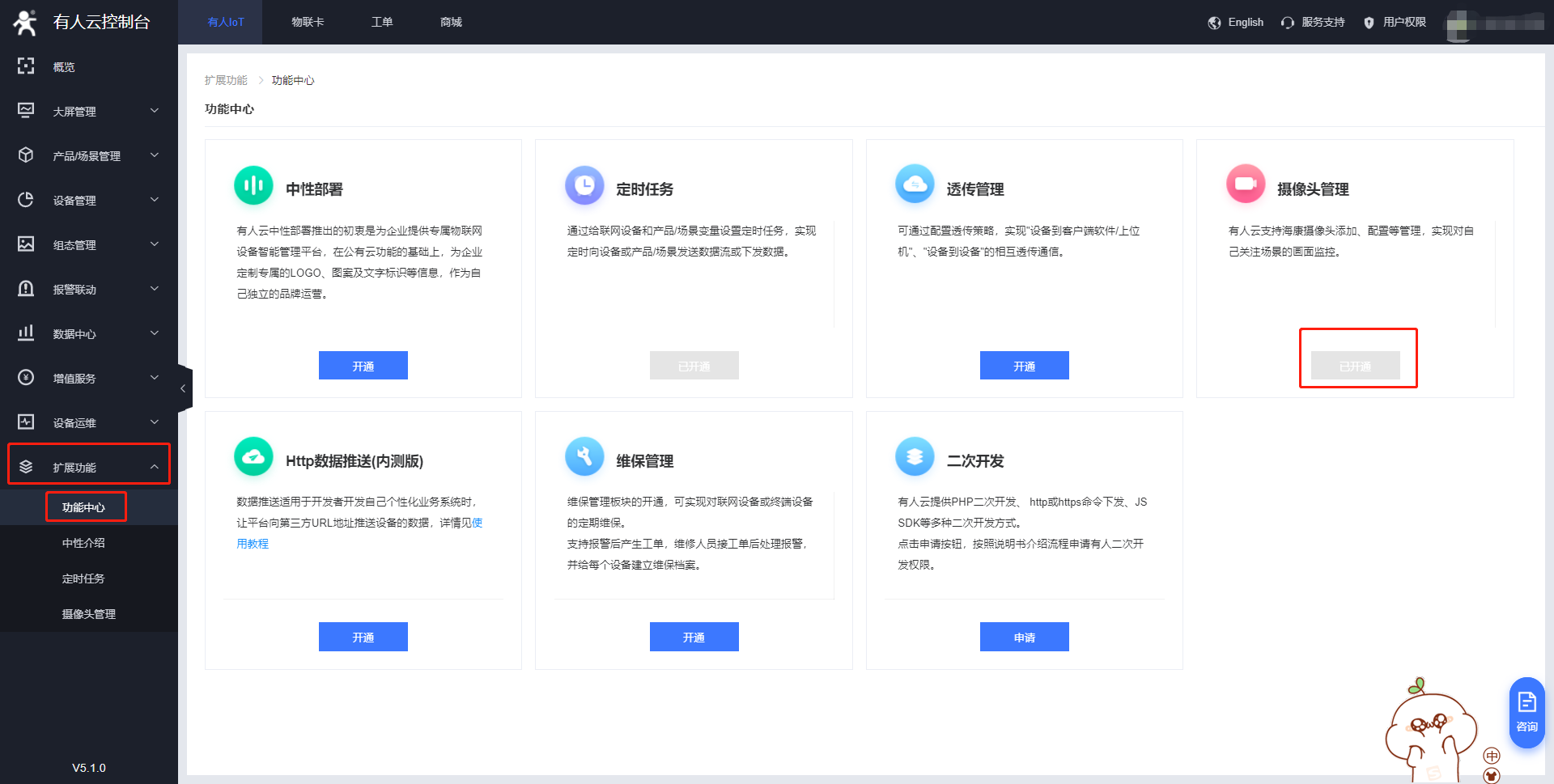 3、在擴展功能---功能中心將攝像頭管理開通,左側列表生成該項欄,點擊進入攝像頭管理