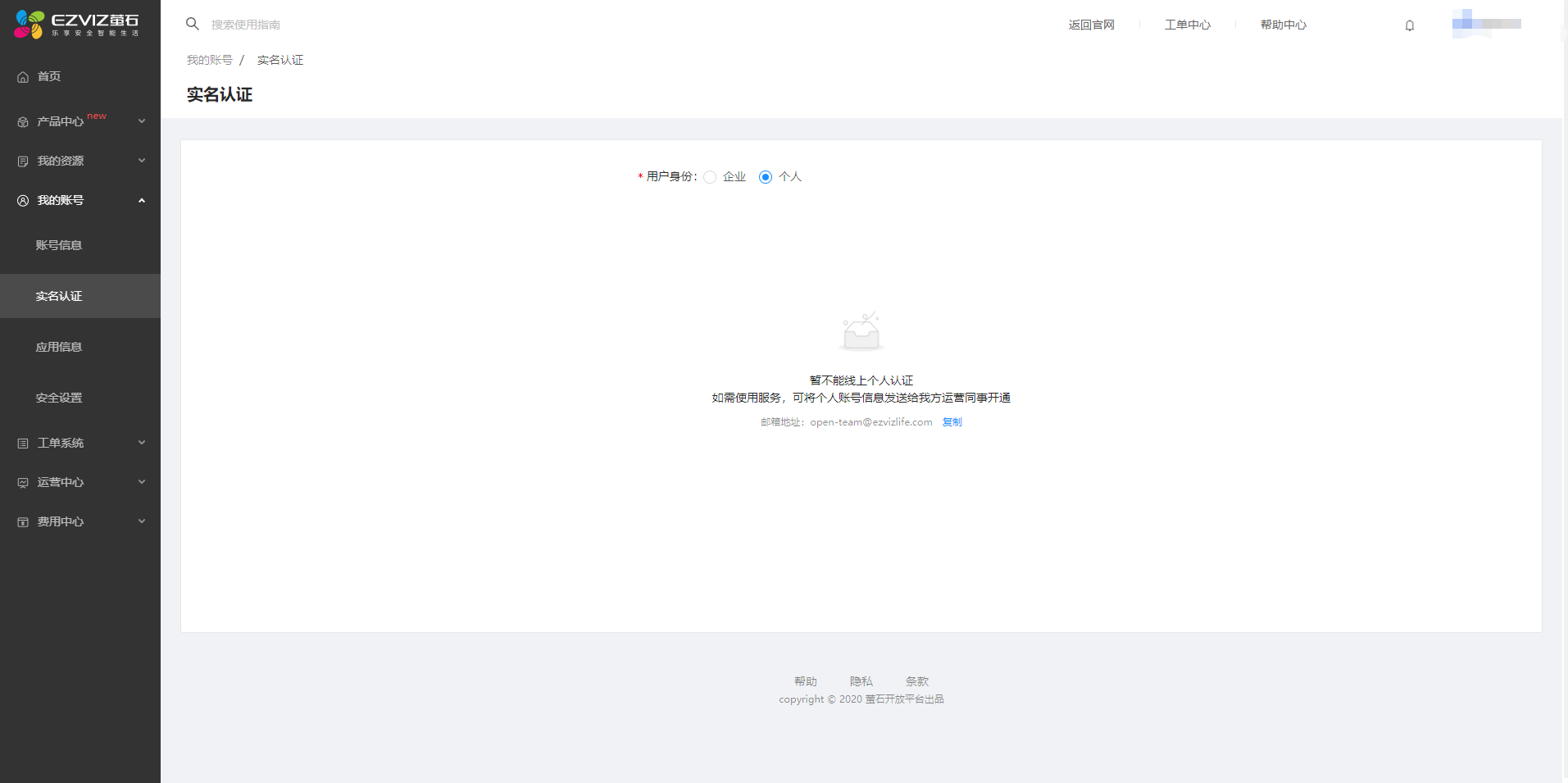 1、在瀏覽器打開螢石云的網址:https://open.ys7.com/mobile/download.html如果沒有螢石云賬號請注冊2、點擊創(chuàng)建應用按鈕,需要進行實名認證公司認證和個人認證二選一即可。