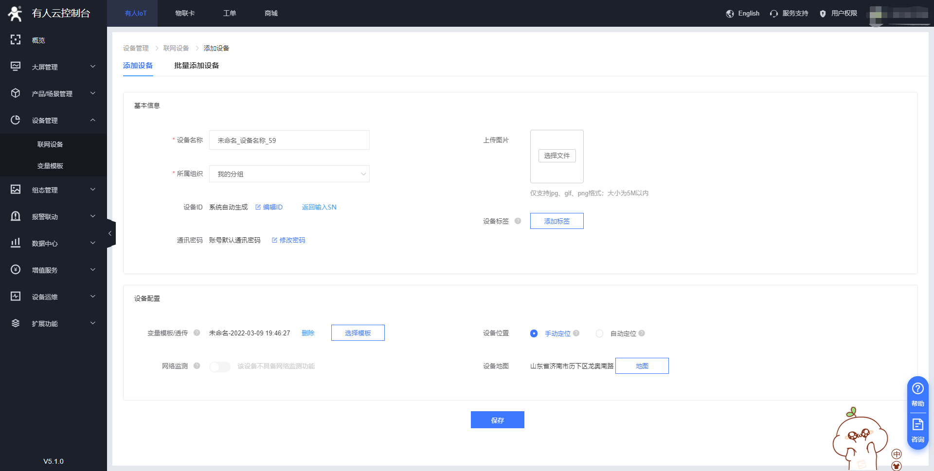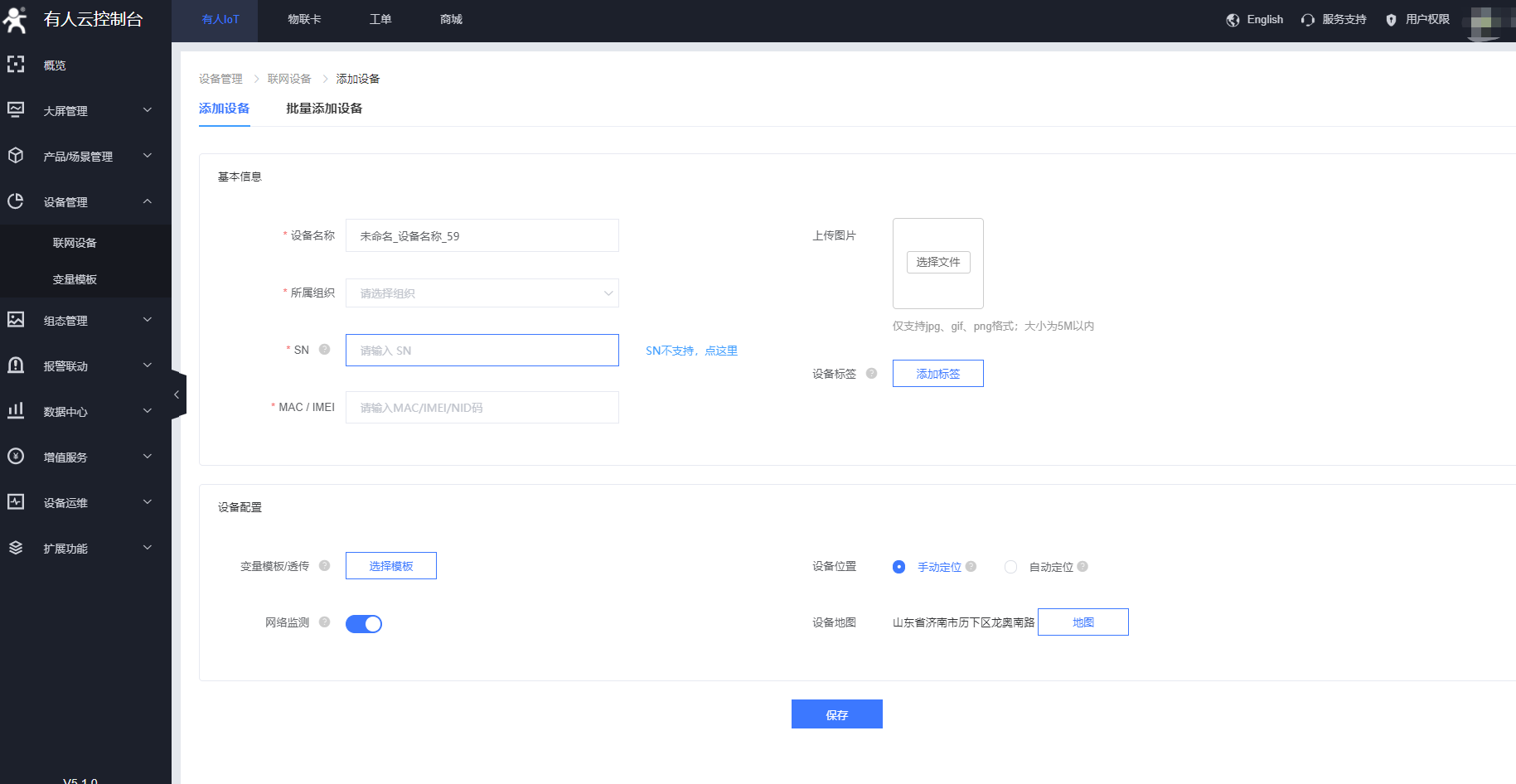 1、登錄云平臺后,在設備管理---聯(lián)網設備---添加設備