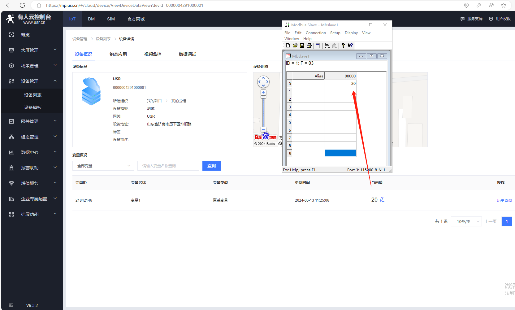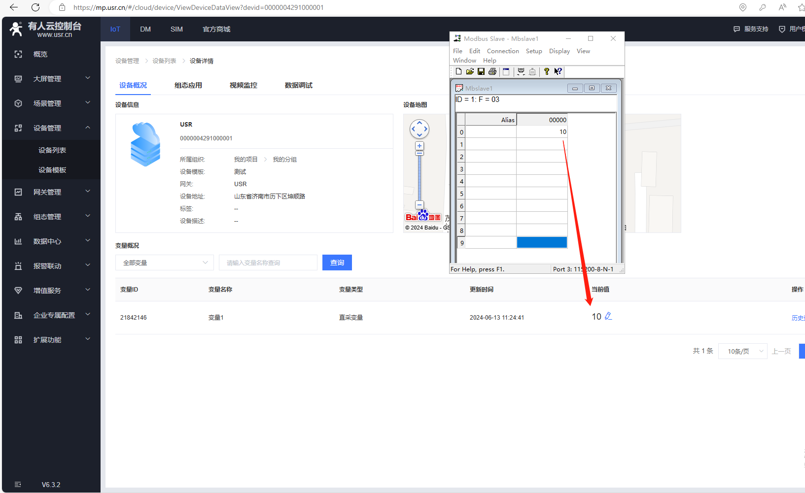 2、MODBUS slave數(shù)據(jù)設(shè)置10,有人云設(shè)備列表1分鐘采集,可以看到變量采集的當(dāng)前值數(shù)據(jù)10。