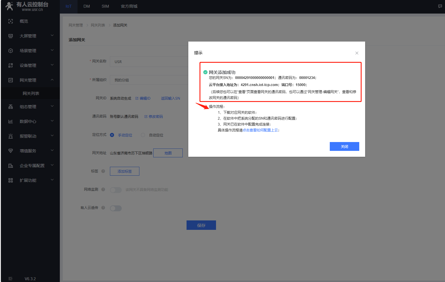 (2)USR不支持SN添加有人云的產(chǎn)品,在有人云添加網(wǎng)關(guān)的時(shí)候,點(diǎn)擊SN不支持點(diǎn)這里,自動(dòng)生成ID和密碼,有人云透?jìng)餍枰P(guān)閉,最后點(diǎn)擊保存。