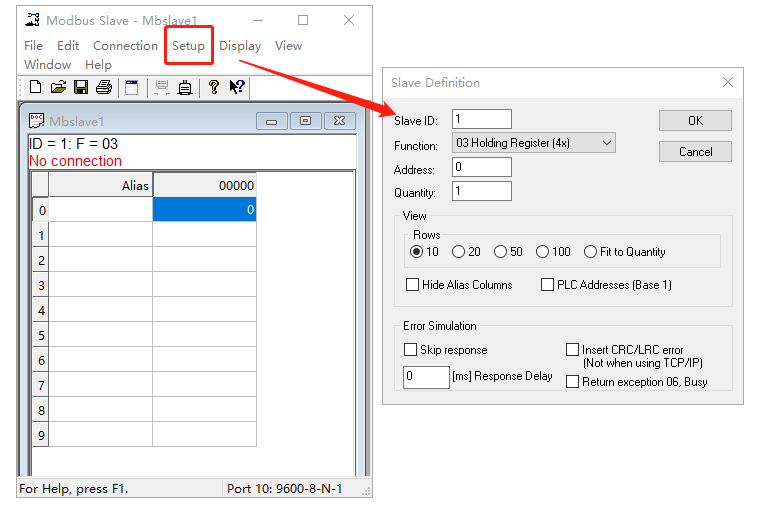 (1)點(diǎn)擊Setup,Slave ID從機(jī)地址用1,F(xiàn)unction功能碼用03,Address寄存器起始地址用0,Quantity寄存器地址數(shù)量用1。