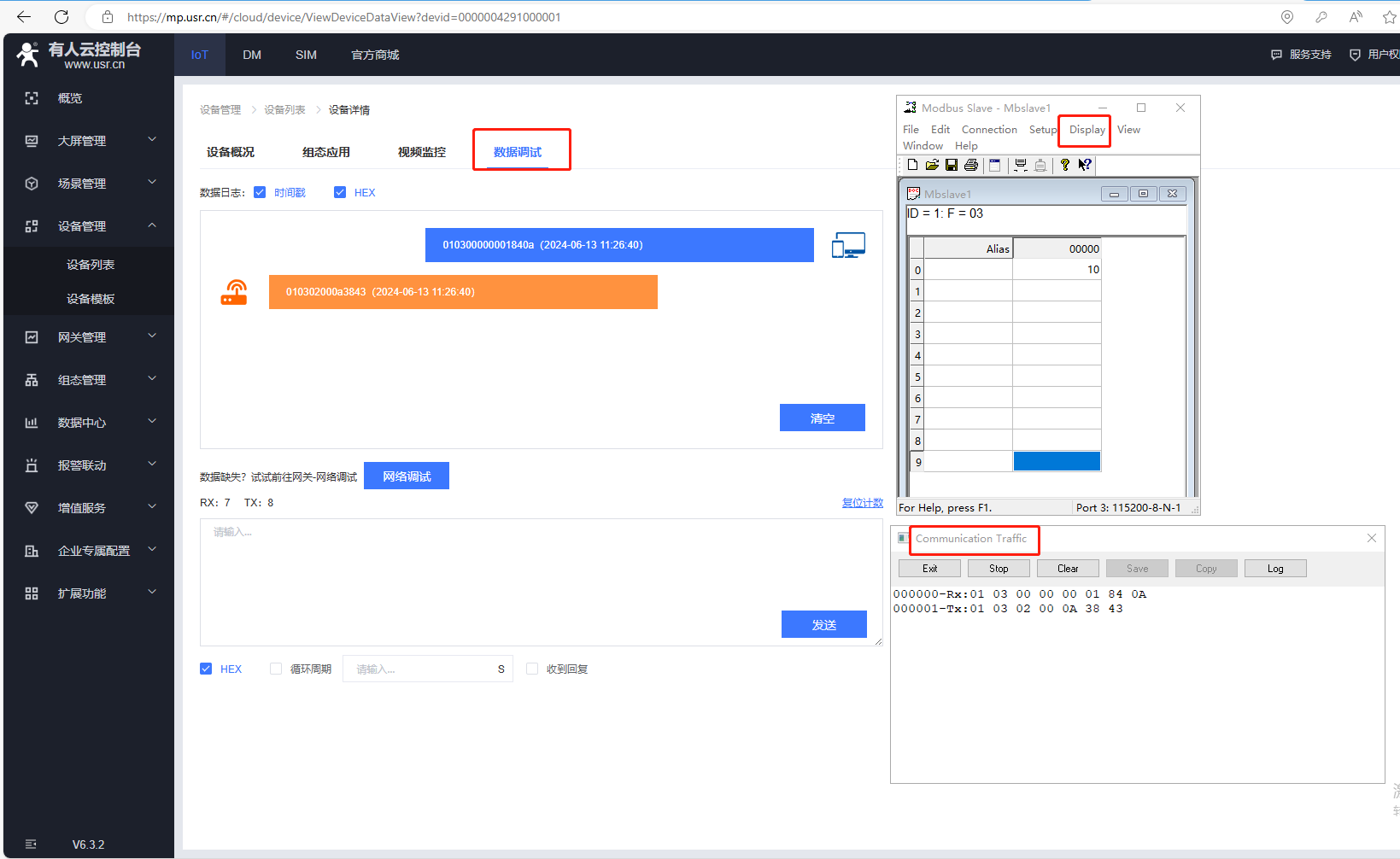 還可以利用有人云的數(shù)據(jù)調(diào)試功能,查看有人云的數(shù)據(jù)收發(fā)是否正常。