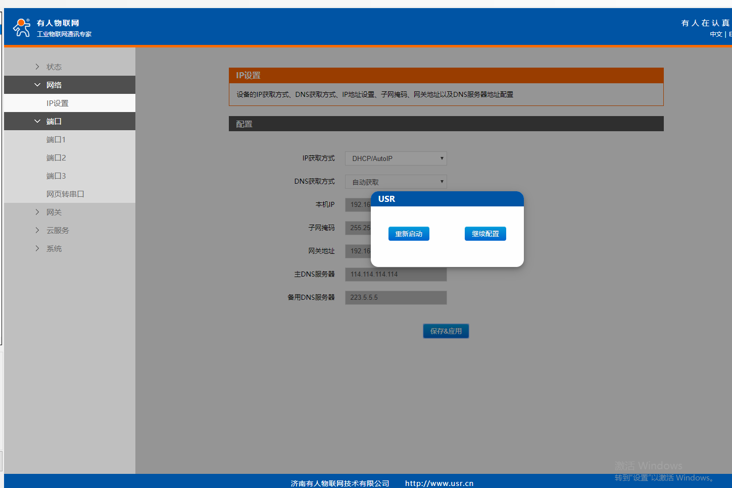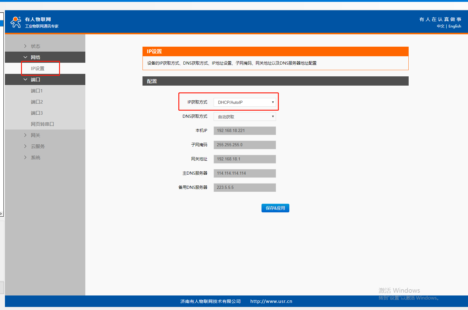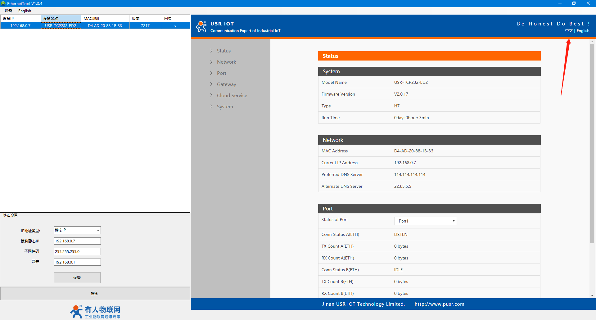 2、USR-TCP232-ED2網(wǎng)頁(yè)切換中文顯示
