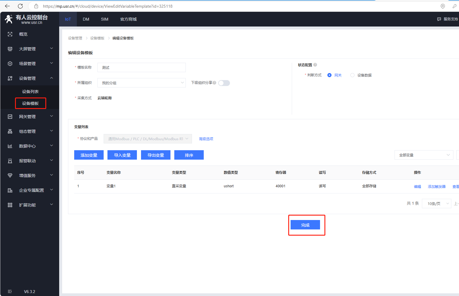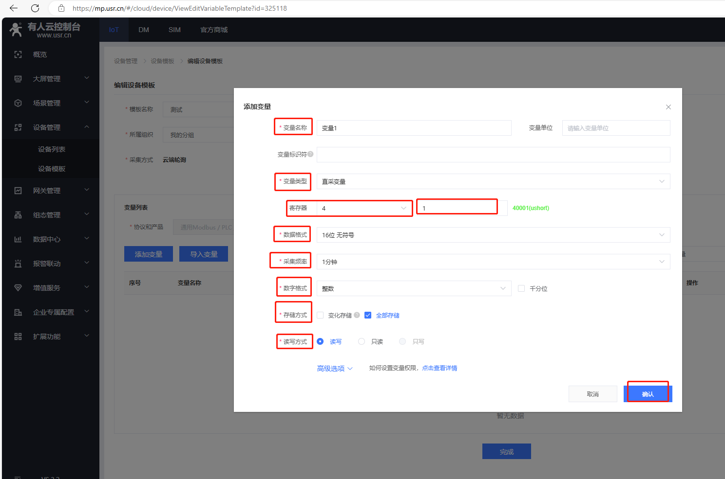 選擇新建模板,輸入設(shè)備模板名稱,通用Modbus/PLC/DL,選擇Modbus,協(xié)議選擇Modbus Rtu,采集方式云端,最后確認(rèn)。