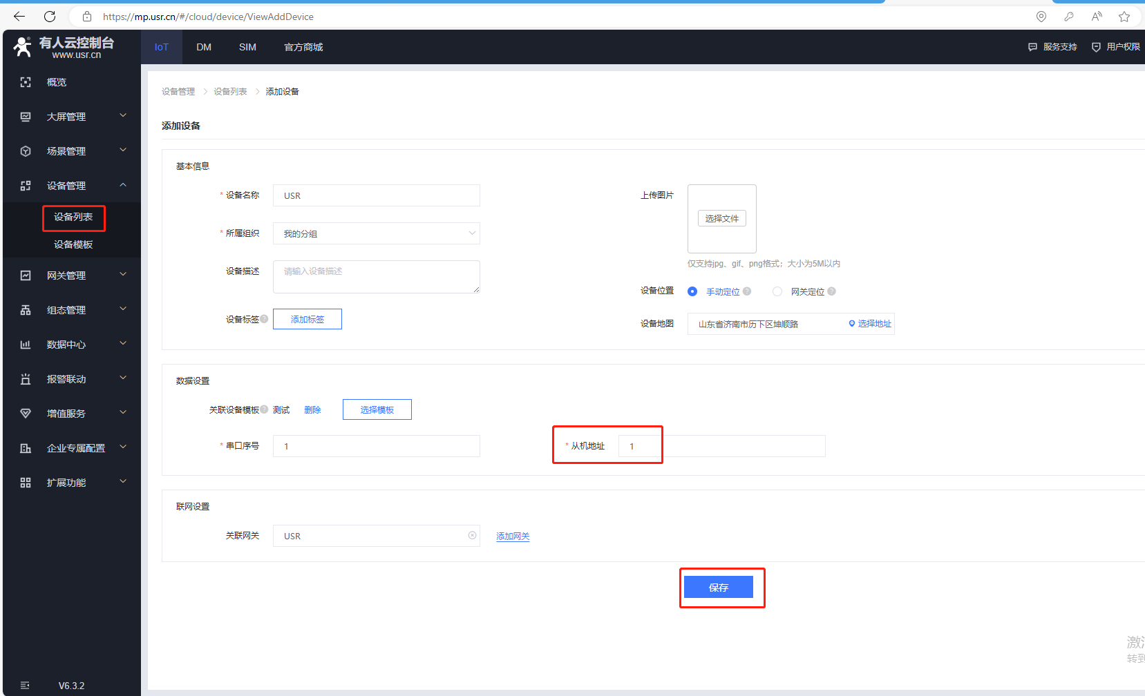 聯(lián)網(wǎng)設(shè)置,關(guān)聯(lián)網(wǎng)關(guān)選擇自身設(shè)備,USR,最后點(diǎn)擊保存。