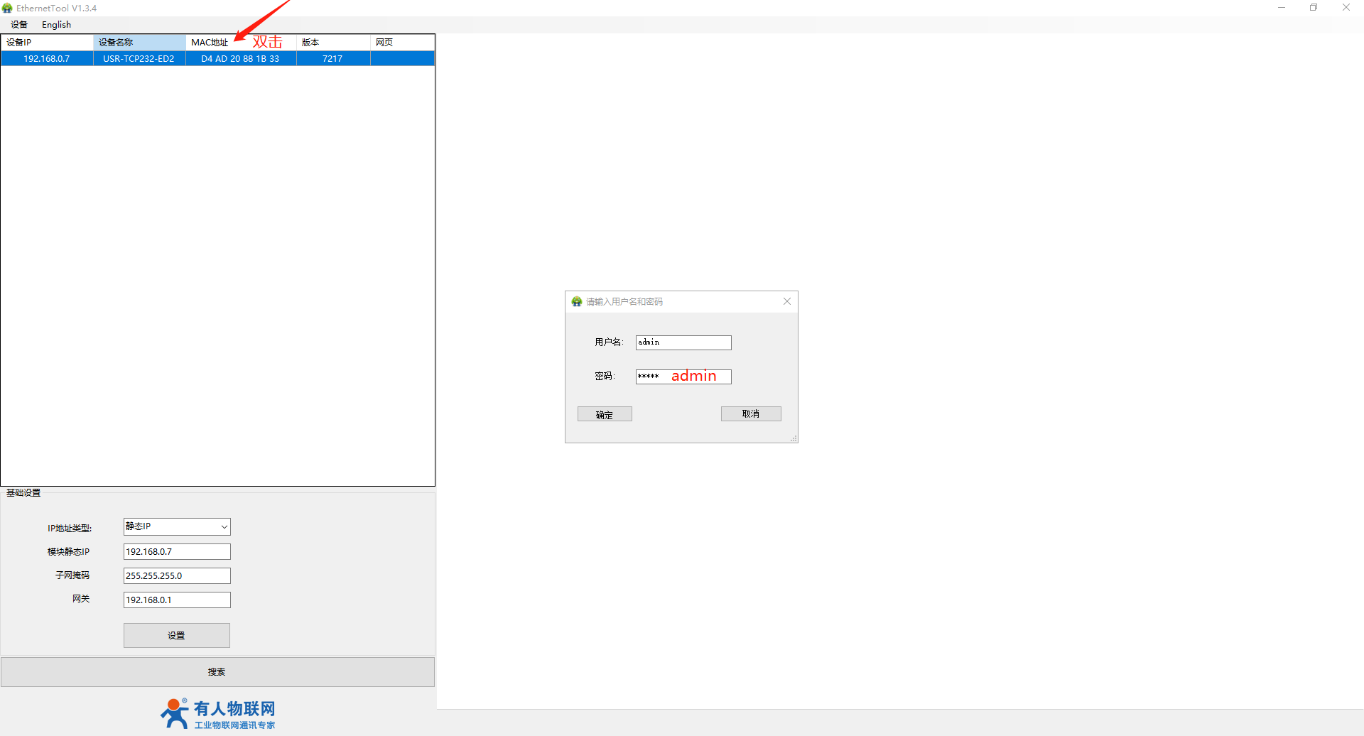 USR-TCP232-ED2和電腦網(wǎng)線直連,打開(kāi)H7軟件,搜到USR-TCP232-ED2的IP。用戶名和密碼都是admin。