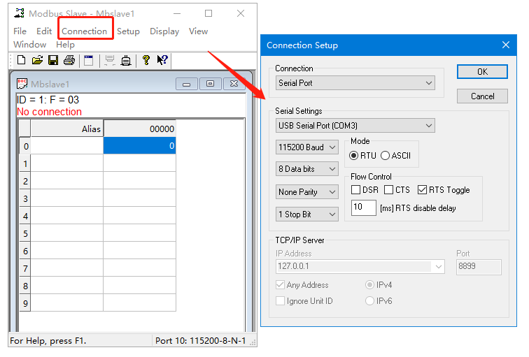 (2)點(diǎn)擊Connection,選擇串口,對(duì)應(yīng)USR所接USB-RS232串口線的COM口號(hào),串口參數(shù)和USR串口參數(shù)保持一致。 Mode選擇RTU,模擬MODBUS RTU協(xié)議串口。