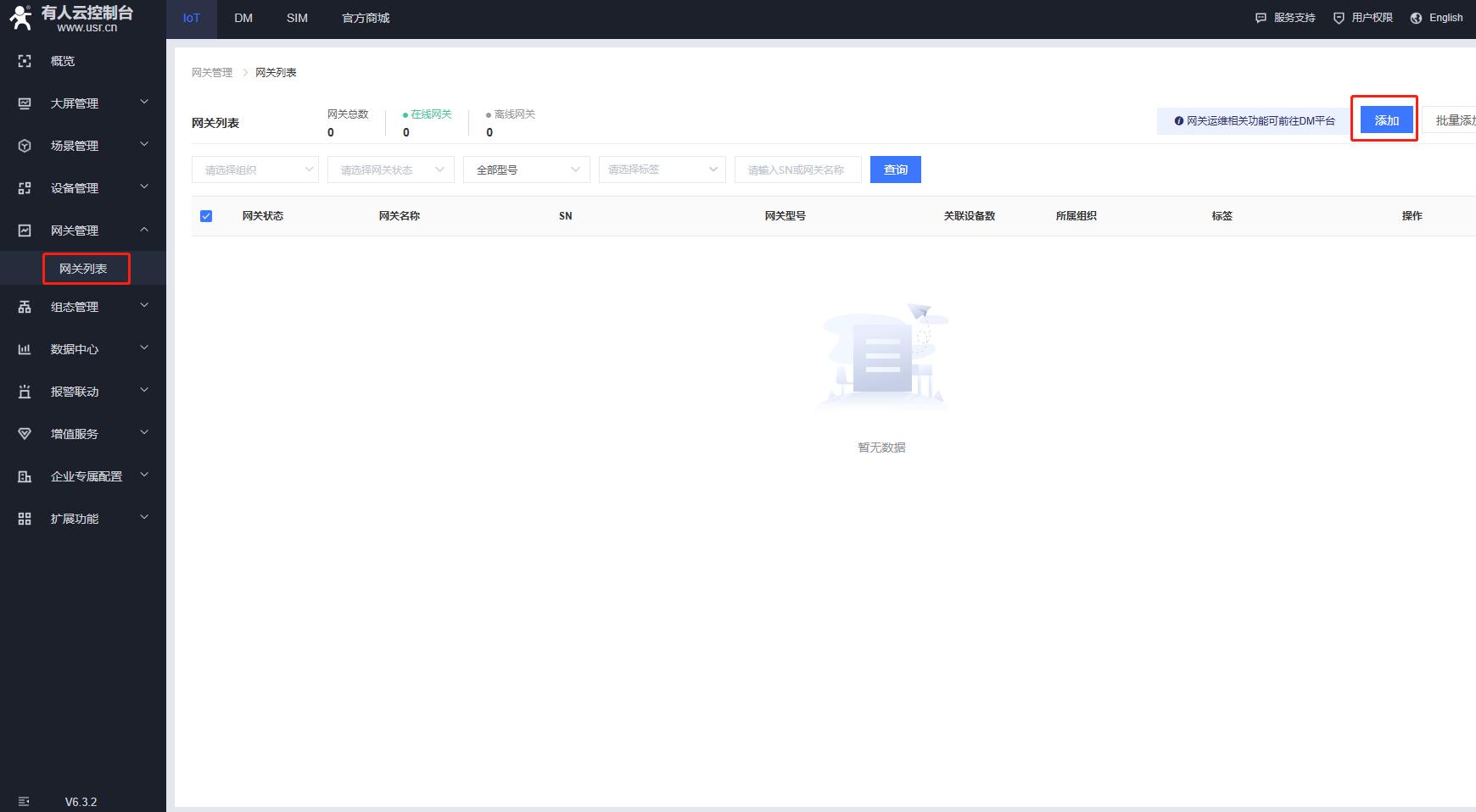 (1)點(diǎn)擊網(wǎng)關(guān)管理,網(wǎng)關(guān)列表,點(diǎn)擊添加,點(diǎn)擊單個(gè)添加。