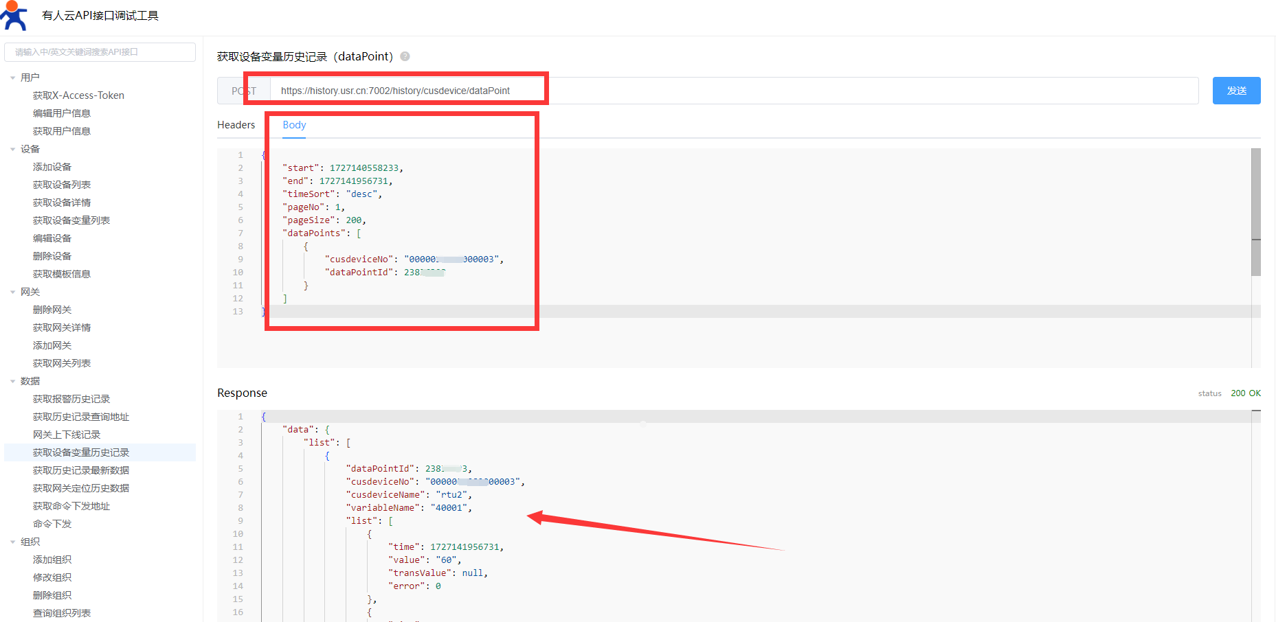C、將說明文檔中示例粘入body,具體參數(shù)需要替換為自己的實際參數(shù),可在平臺查看,發(fā)送后獲取到查詢時間段內(nèi)的歷史數(shù)據(jù)(時間戳格式為unix時間戳ms)