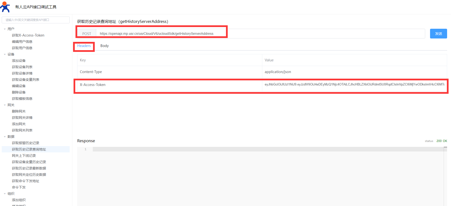 A、將第一步獲取的token填寫到Headers內(nèi)容里(有人云的調(diào)試工具選擇接口后會自動同步url跟token,其他軟件需要手動填入)