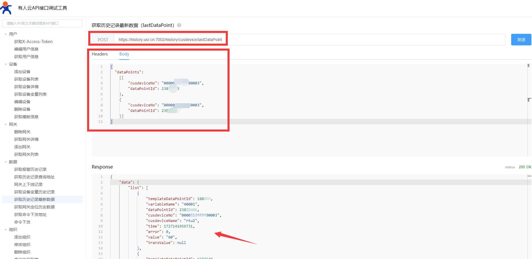 (http://cloud.usr.cn/interface/#/debugger?url=%7Burl%7D%2Fhistory%2Fcusdevice%2FlastDataPoint)