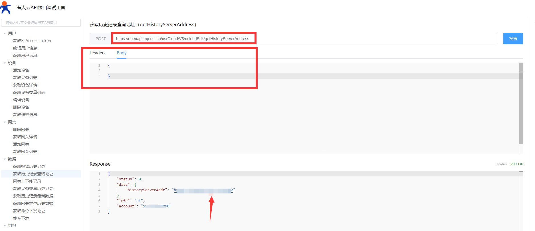 B、將文檔示例中的括號粘過來填入body,點(diǎn)發(fā)送,獲取查詢地址(body內(nèi)容為空對象,不是空著,這里要注意,如果不帶括號獲取會報(bào)錯)