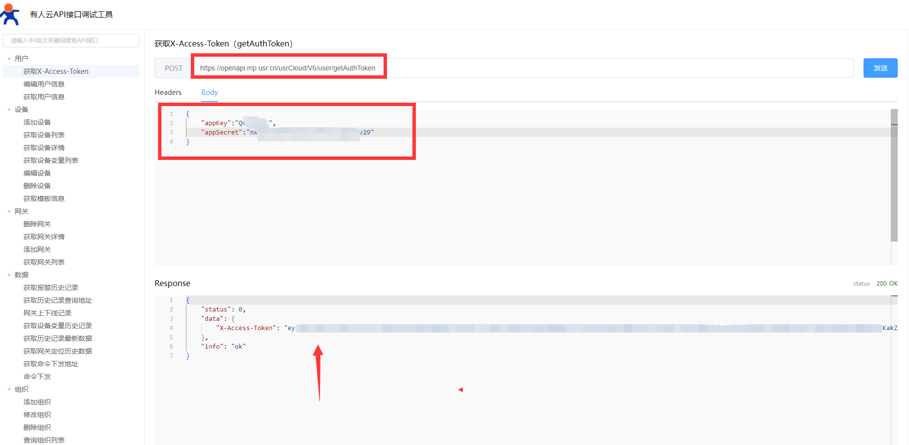 B、打開調(diào)試工具,將獲取X-Access-Token的接口URL跟body請求復(fù)制進(jìn)工具相應(yīng)位置,將具體參數(shù)替換成前一步獲取的密鑰,填寫完成后發(fā)送,可獲取到token