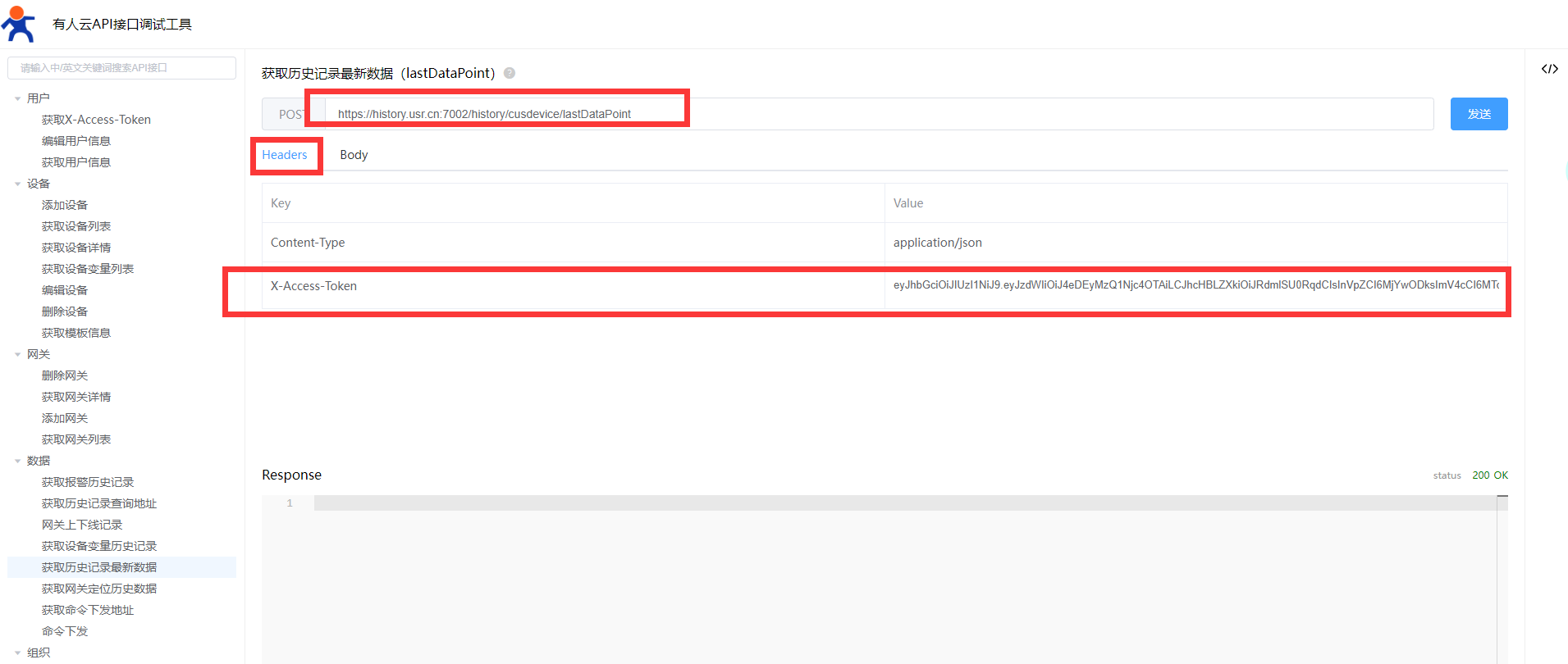 該接口的請求 URL由兩部分構(gòu)成,{url}/history/cusdevice/lastDataPoint