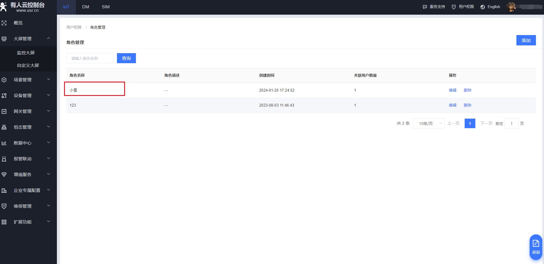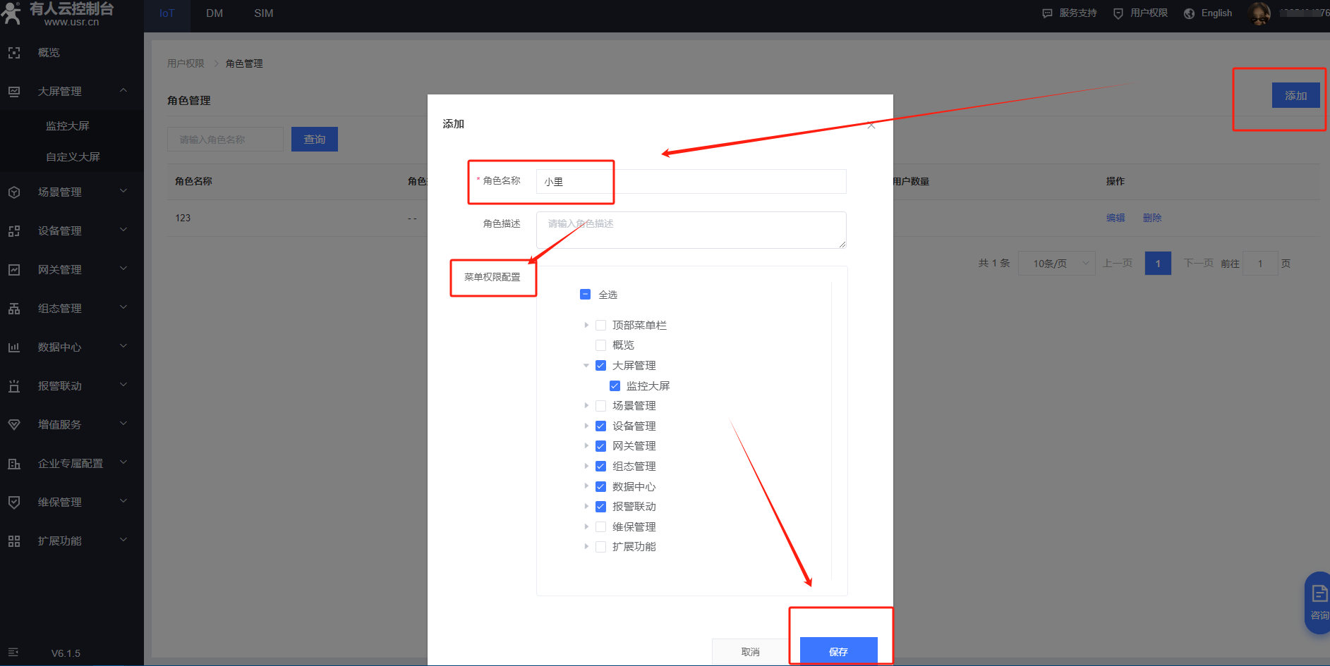 1、首先在用戶權限——角色管理,添加角色,選擇要給角色分配設備權限,保存