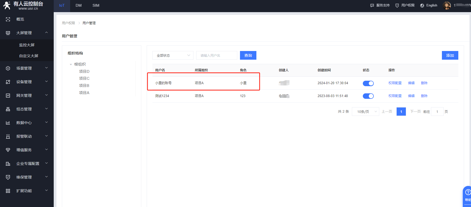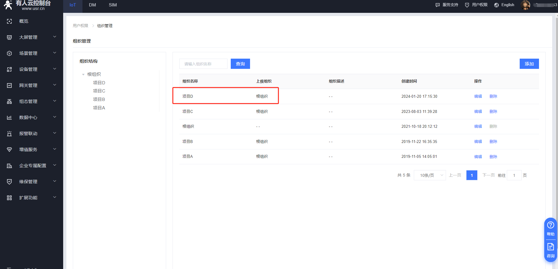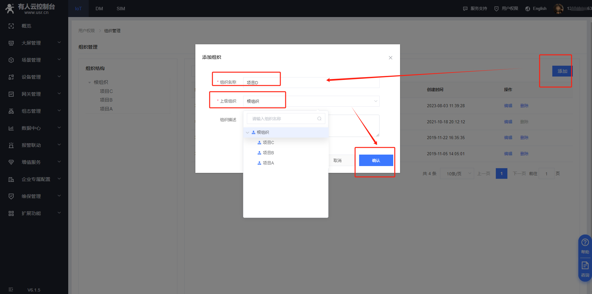 在iot平臺——用戶權限——組織管理,添加新組織,組織名稱可以自定義,上級組織選擇在在哪個組織下添加為新的組織,案例里上級組織是選擇的根組織,點擊確定,可以看到新添加的組織